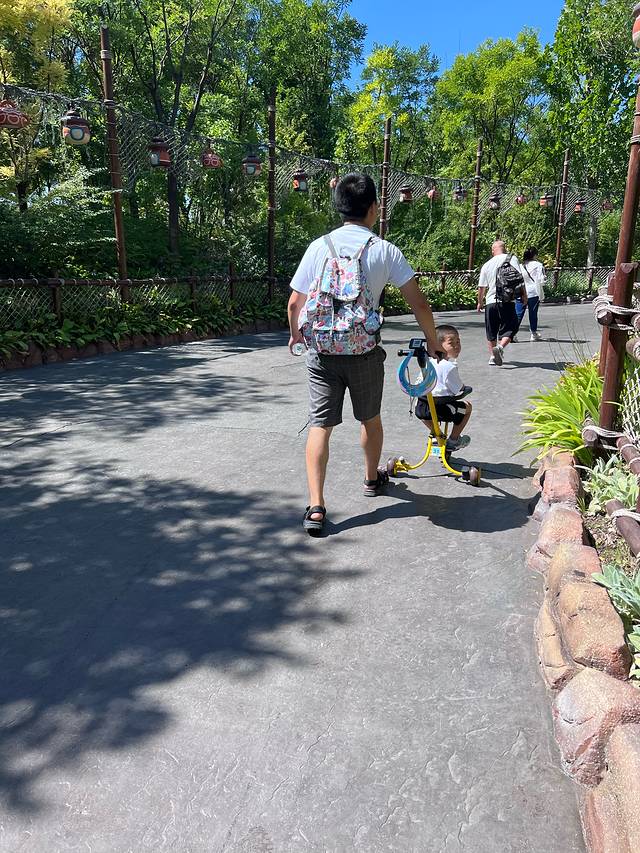 带小孩子的务必租一辆小车车吧,60一天。也可以自己带车车进去,很方便。随手停就可以了。代步车太贵了,旺季两人的要398,三人的498貌似,以此类推感觉死贵,园区也不大其实大人是可以走动的。
