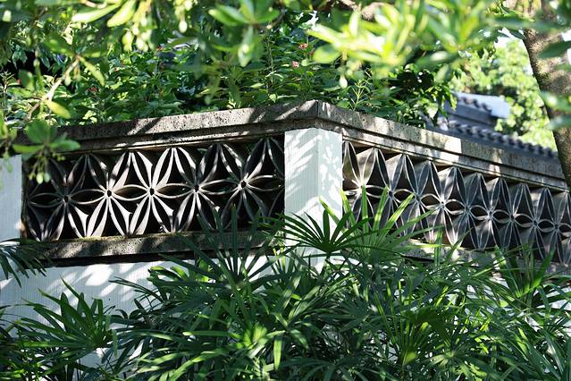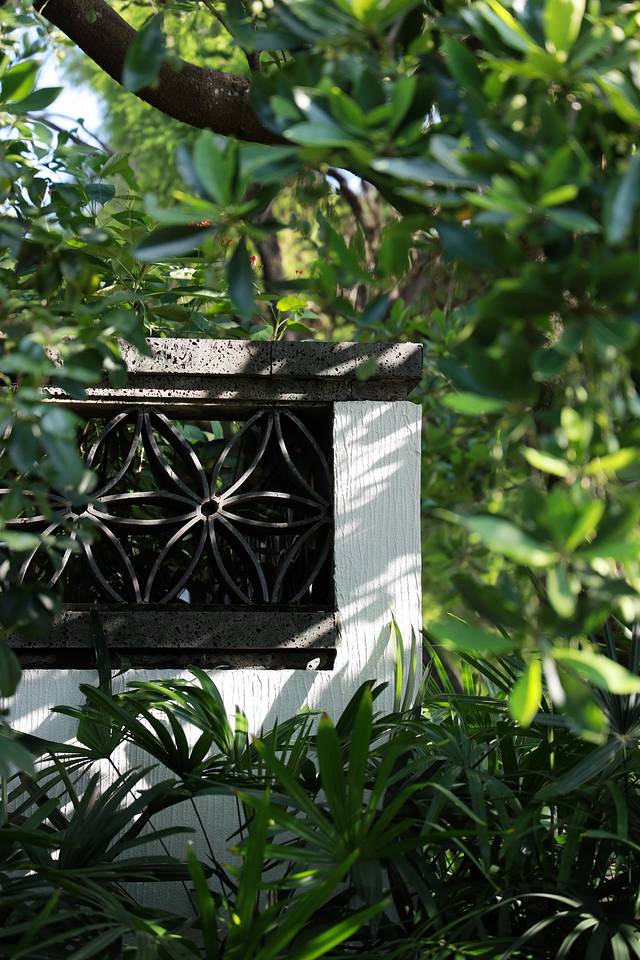 窗牖是开在墙壁上的窗,行馆为各别墅建筑的白墙间都建有青瓦拼成的窗牖,别致又利于自然采光。