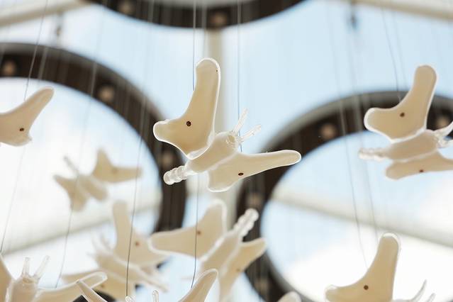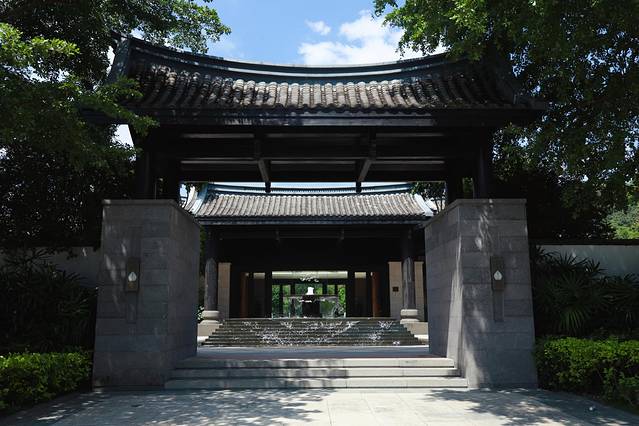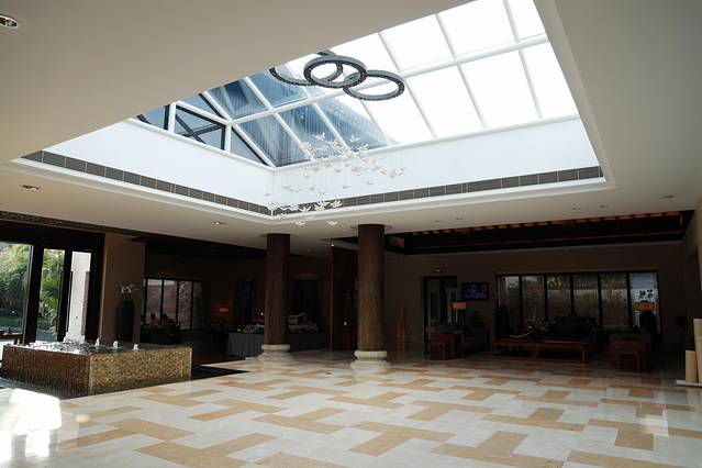 行馆按照传统闽南古厝的布局特点设计,大堂宽敞明亮,玻璃穹顶下悬挂着的蝴蝶吊晶莹灵动。简约而不简单的素雅风格,形成了悦泉行馆自己独特的格调。