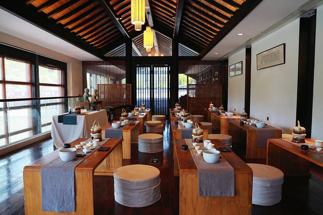 安溪茶文化历史悠久,悦泉行馆在保存和弘扬传统茶文化上不遗余力。行馆大堂二层「赏韵阁」,定时开设茶艺课,大人小朋友都能参加。