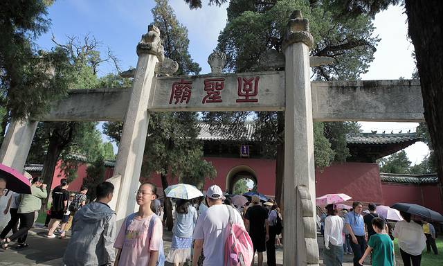 曲阜孔庙始建于鲁哀公十七年(前478年),历代增修扩建。孔庙前万仞宫墙,意围墙有万仞高,用以称颂孔子学识渊博高深,相传为康熙皇帝手书。