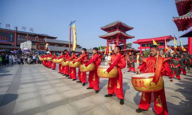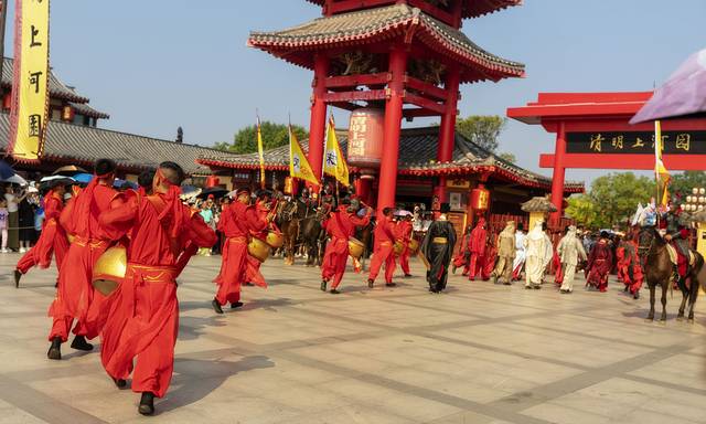 早上九点,清明上河园“包公迎宾”入园仪式准时开场!粗犷的栅栏猛地抽开,一群“红孩儿”敲锣打鼓,鱼贯而出!