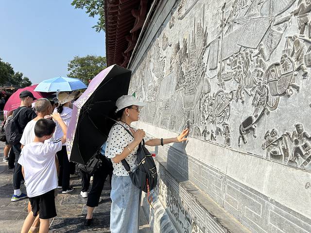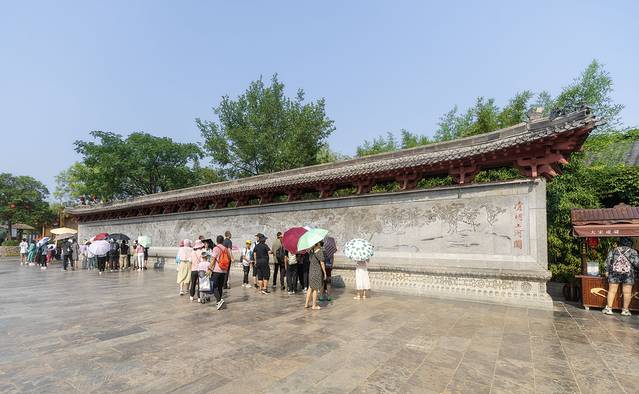 入园迎面而来的是一尊手持画卷的人物雕像,盲猜肯定是张择端!后面紧接着就是根据他传世大作《清明上河图》制作石雕。石雕全长33.32米,高2.23米。