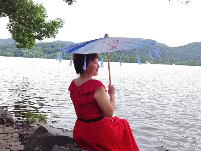 老妈看见【断桥】立刻想冲,冲到一半我们又看到游船码头,乘了最后一班船(大约16点半)到小瀛洲逛了一圈。一上【小瀛洲】,老妈很开心,买了蓝色的油纸伞撑着拍照。