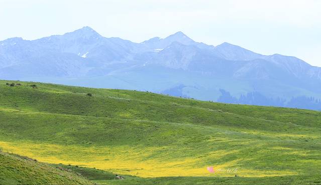 草地上开满了黄色的小野花,远处的山顶上覆盖着皑皑白雪!