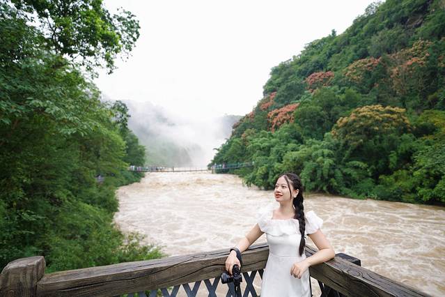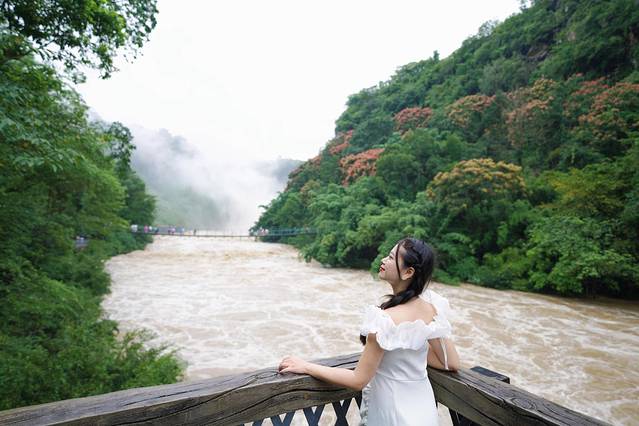 而与想象中不同的是,水的颜色不是透明的,是如黄河般的黄。没办法,谁让昨晚下了好几个小时的暴雨呢,雨水带着泥土从山上冲下来,才有了眼前黄金版的黄果树瀑布。黄果树瀑布景区其实分为了3大块区域,眼前的大瀑布是最精华的一个点,其余几个点需要坐车才能到。你可以参考我走的这个顺序:
