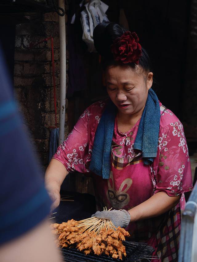 办理入住完后,可以坐车去1号风雨桥附近,下车后去0号风雨桥逛逛稻田那块。这里的稻田现在看起来还是很美的,而且这里有赶鸭子,骑马之类的项目,如果是带娃,在这里就能玩上小半天。之后可以去古街吃吃喝喝,路上买最多的是黑猪肉串和糍粑,糍粑不管哪一家都是一样的,黑猪肉串可以找那个带着红花五十多岁的阿姨那,她家的猪肉比别家要大上不少,调料也比较少,1元1串的猪肉可以吃到开心。
