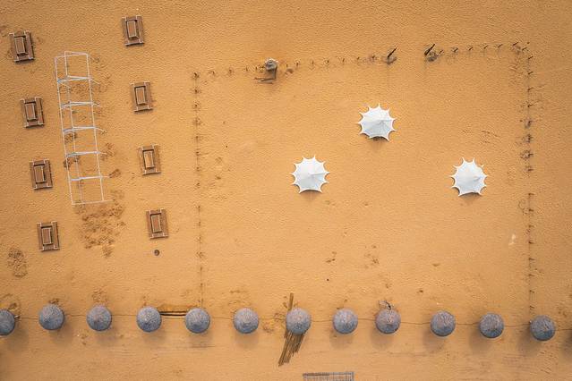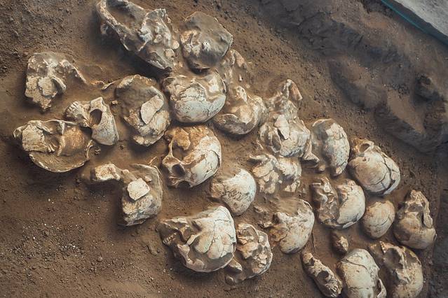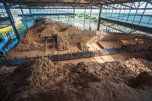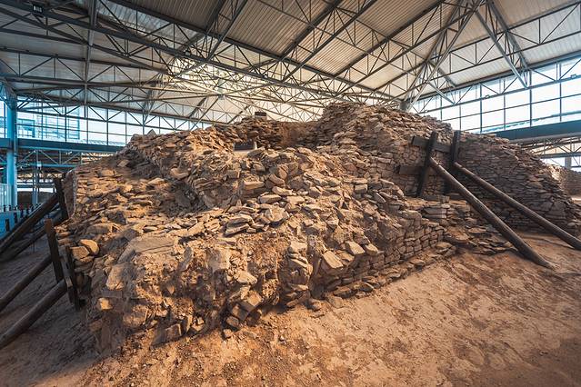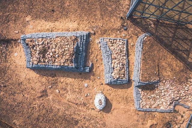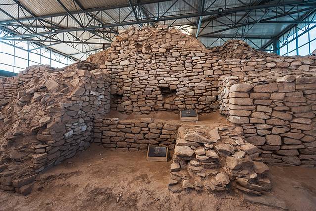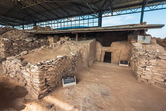 皇城台如今还在考古发掘中,没有对公众开放,而石峁遗址博物馆也还在建设中,目前开放参观的只有外城东门遗址。体量巨大的东门遗址包含内外两重瓮城、砌石夯土墩台、门塾、马面等城防设施,光在这片区域就出土了壁画、祭祀头骨、玉铲、玉钺、玉璜、牙璋、陶器和石雕等大量文物。