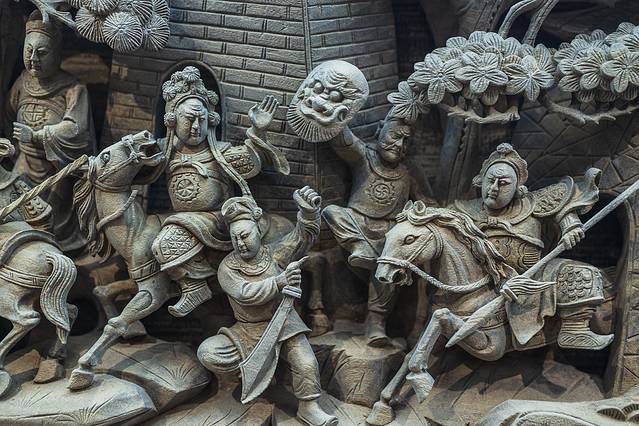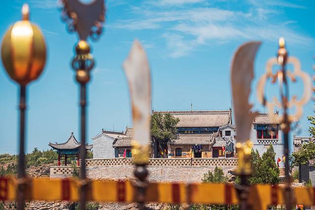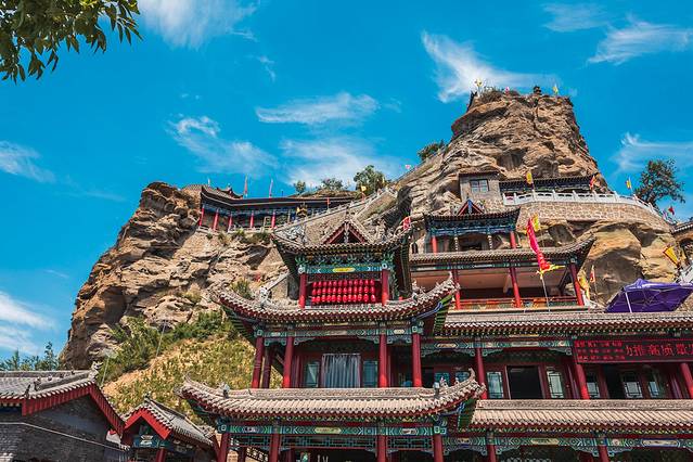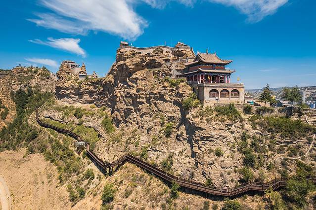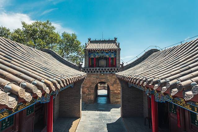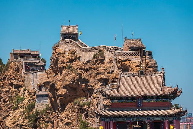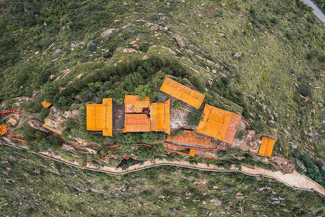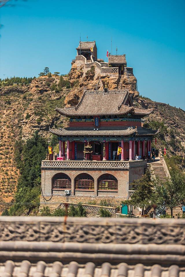 刀锋般的山脊上,前后一公里绵延分布着明清以来庙殿亭阁百余间,八仙洞、地藏洞、三身佛洞、浩然亭、二郎庙、三教殿、玉皇阁、娘娘庙……古建筑疏密相间,错落有致,保留有完整的石刻九龙照壁和石刻卷顶,以及部分壁画、碑石、题字。