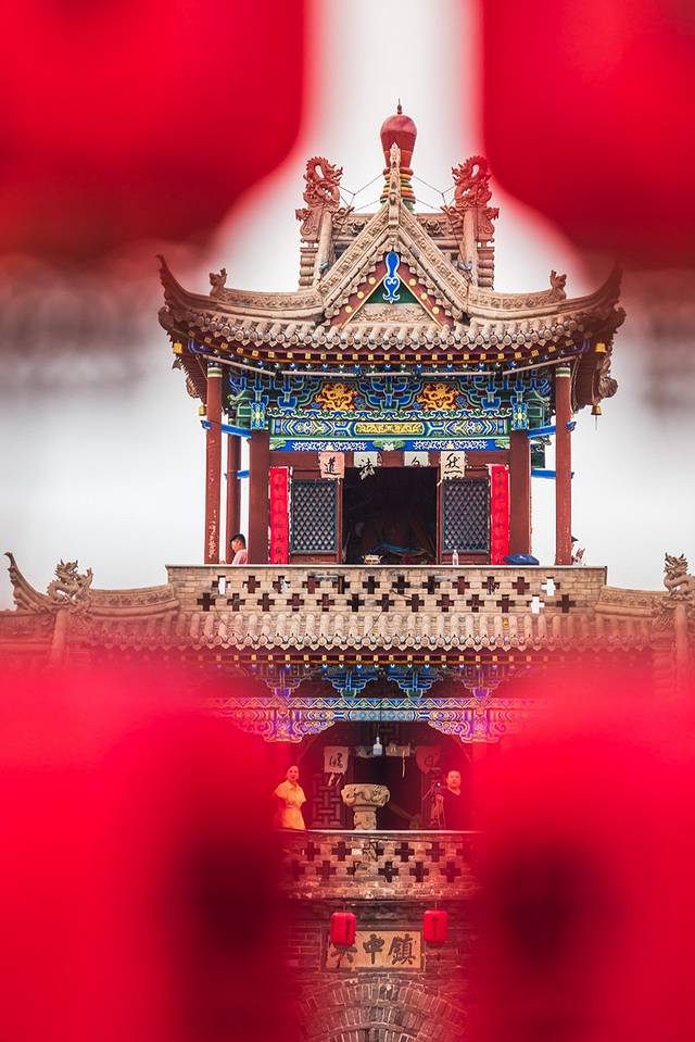 我从南门一进入高家堡,便看到城中心坐落方方正正一栋三层楼,名曰“中兴楼”,楼的底层有四个门洞,向东西南北四个方向敞开,相当于古镇的交通枢纽。楼上则有玉皇阁、日月洞、观音殿、关公老爷殿,石额上的字体隽秀,清晰可辨。