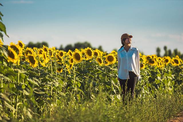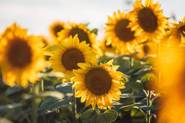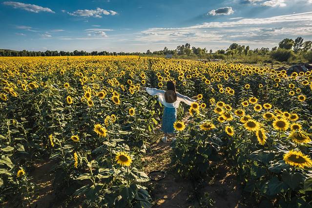 无边无际的绿色海洋在阳光的照耀下翠绿欲滴,仿佛是大自然为我们铺展的绿色毯子。向日葵花海如同一幅色彩斑斓的画卷,为整片草原增添了浓郁的生命气息。金黄的花瓣在阳光下绚烂耀眼,犹如成千上万颗太阳在大地上开放。