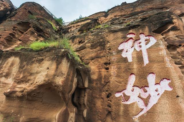 下山的时候,我沿着山腰上的大路往回走。亿万年的风雕雨刻在道路右侧的山体石壁上蚀出千疮百孔,历代文人墨客在石壁上挥毫泼墨,摩崖题书,其中“一山览秦晋,二水锁烟霞”的诗句最为出名。