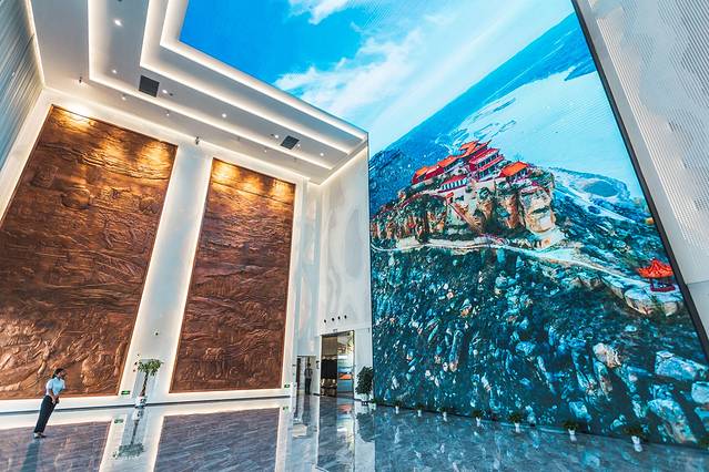 窟野河畔的和谐广场上,神木大剧院、政务中心和神木城市展览馆三座巨大的建筑一字排开,格外醒目。迈入城市展览馆一层大厅,面前一个巨大的屏幕从天花板延伸至脚下,上面正在播放天台山的绝险风光。