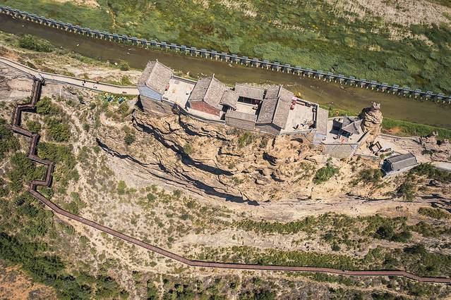 从刘志丹东渡纪念馆的顶层登临天台山顶,顺着比二郎山还要逼仄的山道往南行去,最窄处只能并行两人,四周坚石突兀陡峭,造型奇特。向东眺望,滔滔黄河奔流而去;向西俯瞰,窟野河水擦着山脚而过,蜿蜒汇入黄河。