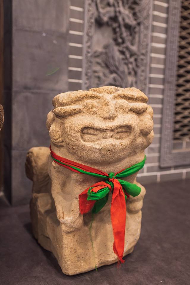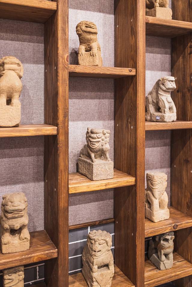 这个非物质文化遗产实物陈列馆就在神木市文化馆的二楼,面积算不得很大,但展品琳琅满目,数量和种类都比我想象的要丰富许多。就拿石狮子来说,馆内有一整面墙造型各异的石狮,造型古朴洗练,神情生动有趣,完全不是以往常见的那种细腻写实的风格。