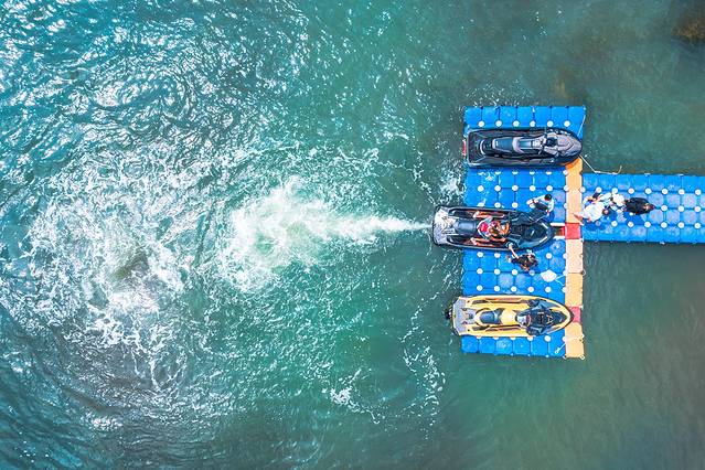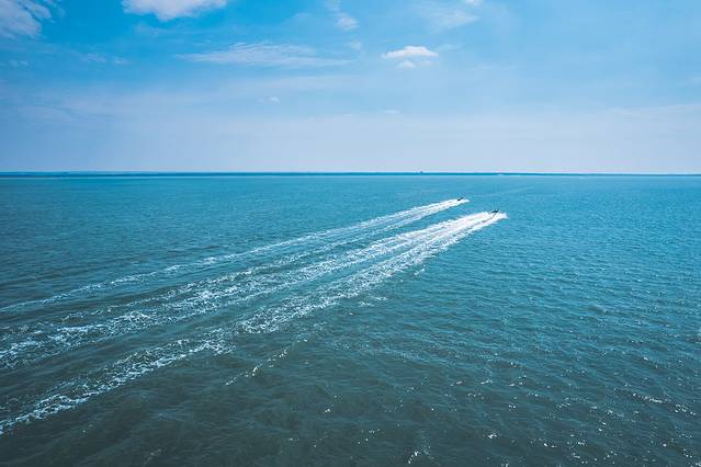 走过细腻的“沙滩”,在码头坐上游船,四周碧蓝的湖水清透澄澈,与天空相融构成了一幅令人陶醉的画面,坐在船上盯着浪花看久了,恍惚间还以为到了泰国或马代。