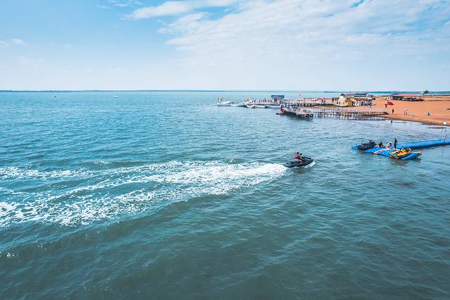 水上和沙滩娱乐项目,大多集中在湖西北岸的叨唠窑则欢乐岛,这里的沙滩上还有不少浪漫打卡点,可以拍出美美的照片。沙滩上戏水的孩子,绽开出的笑容和平时是完全不同的。