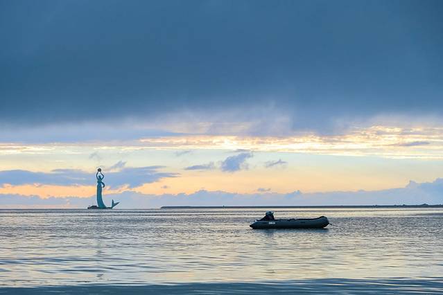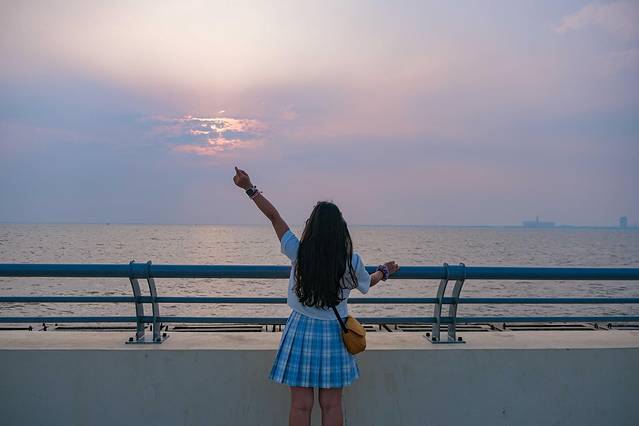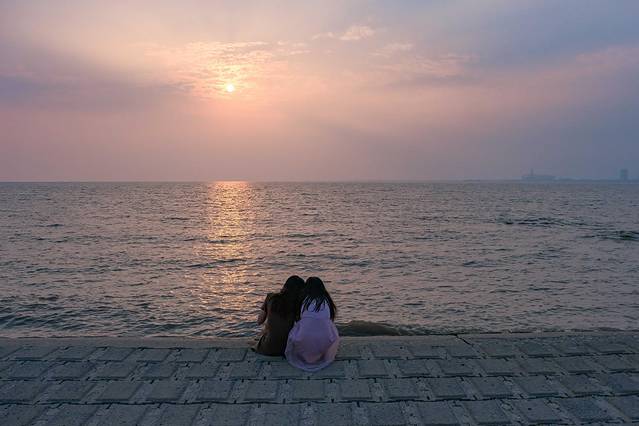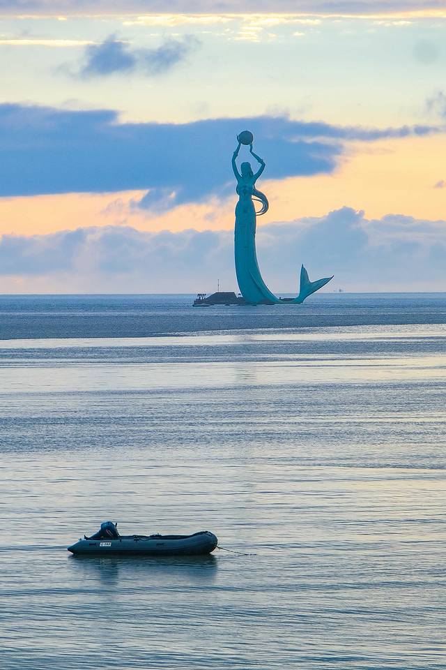 一场大雨过后,傍晚放晴的山海广场,晚霞满天,把海岸线和鲅鱼公主雕塑染得通红,就静静地坐在海边,看一场浪漫的山海日落也不错。