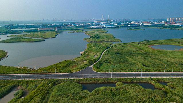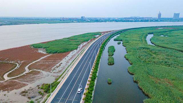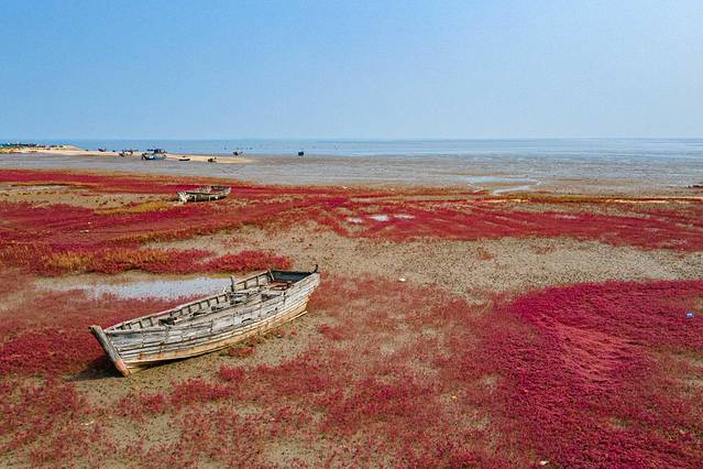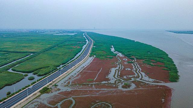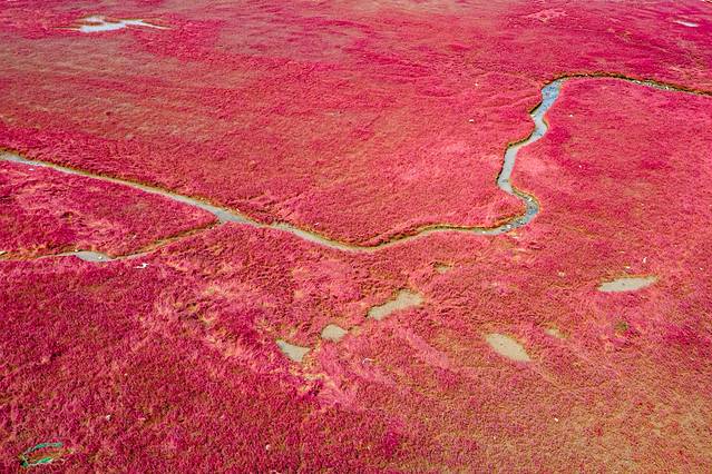 一大片绿色的湿地与红如火的碱蓬草交相辉映,勾勒出一副属于辽河文化产业带的美丽画卷。