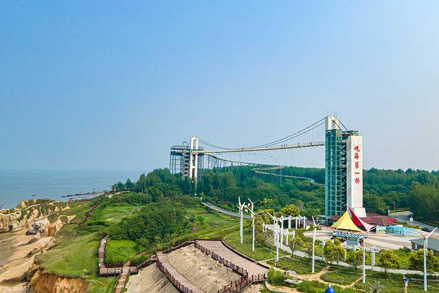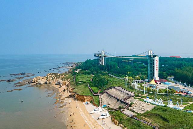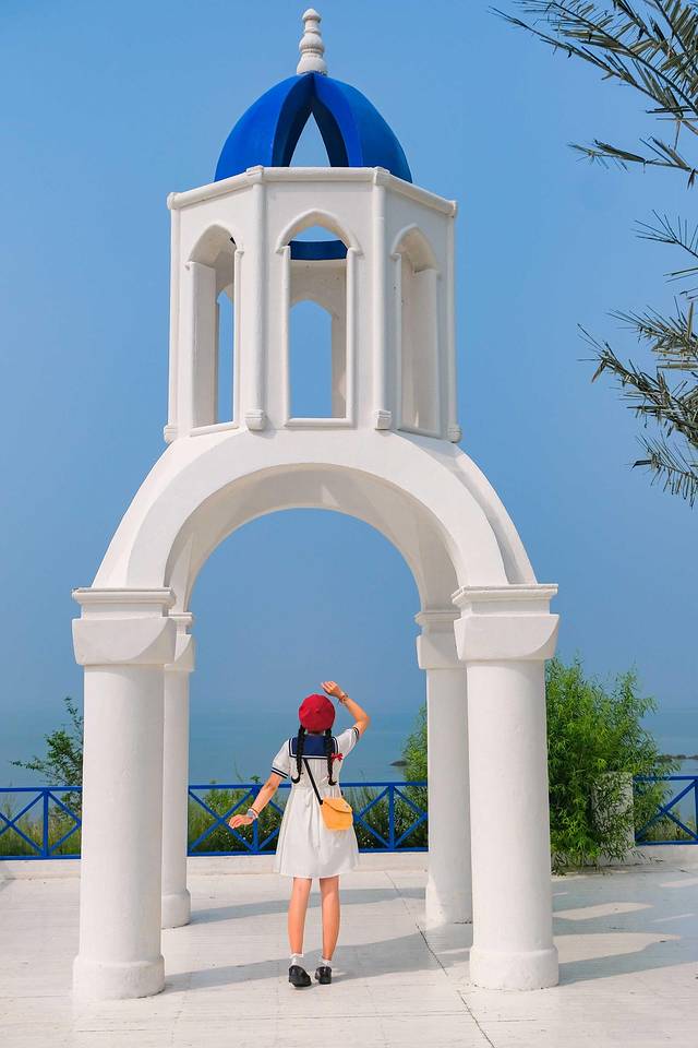 从景区大门步行几分钟,便能看到大海,还有海边的网红打卡地“小圣托里尼”,虽然这里是专门的婚纱照拍摄基地,什么无边泳池,海边教堂,小阿那亚,荷兰风车,玻璃栈桥都有。天气晴朗,或者日落时分拍照,都非常的出片!