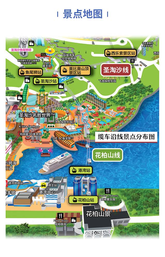 ▪ 2、缆车。分为两条路线,花柏山线(进出岛线)和圣淘沙线(岛内线)。