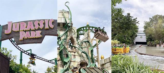 ✔“侏罗纪河流探险”:类似迪士尼的“雷鸣山漂流”,自备卡片雨衣,现场买5新币一件,脚抬高点哈鞋会湿。漂流和木乃伊紧挨着且都需要存包,但排队人不多的前提下建议都存在木乃伊的存包处,那里超过1小时才收费,漂流那里存就需要收费,起步价4新币。