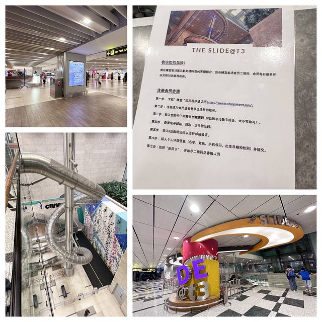 ▪ 机场T3和T4分别有两个巨型滑梯。T3的有一高一矮(分别下滑口在4层和2层),矮的可以随便玩耍,高的那个需要到B2服务台下载APP并注册商场会员后,可以拿到免费玩10次的二维码。有一丢丢刺激。