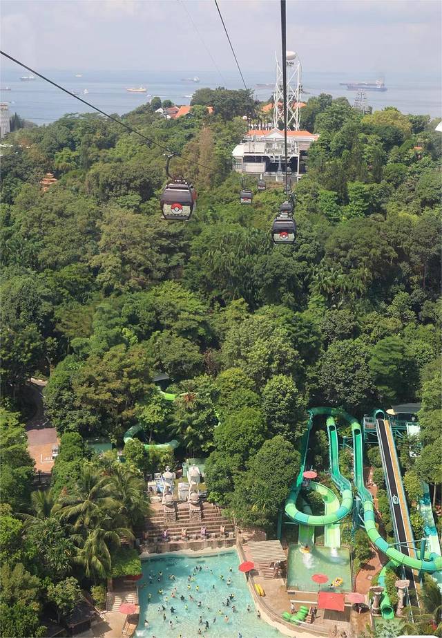 ★温馨提示★ 缆车是允许带行李箱上车的,4个人3个登机箱承载力完全没问题。你也可以到站不下车继续坐在上面观光,但车厢内是没有空调的,大晴天可能会比较闷热,可以打开玻璃和门上的窗户通风。我们离岛乘缆车前刚下过雨,凉爽舒适。圣淘沙岛、水上探险乐园和海豚池尽收眼底,繁忙的马六甲海峡清晰可见。