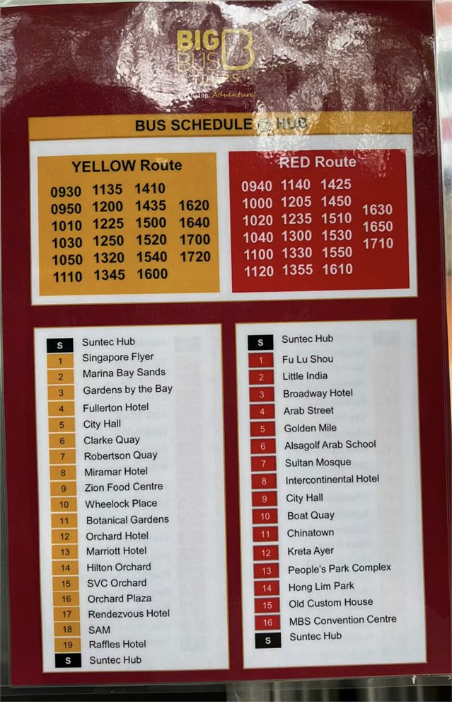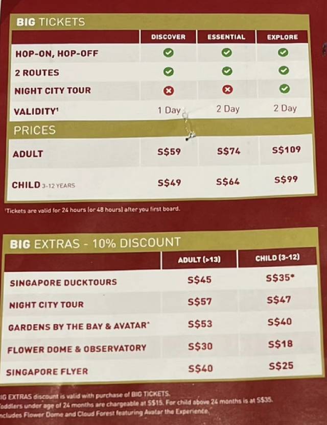 【Big Bus】:观光巴士。有红色和黄色两条线路。红线主要经过牛车水、小印度、甘榜格南、三大民族聚集区;黄线主要经过乌节路、植物园、CBD等现代化景点,在车上既能欣赏现代的城市风光,也能感受有趣的民族文化。Tao宝票价更合适人民币277元/人,也可以在新达城直接购买。(泛太平洋酒店附近,和水陆两栖鸭子船在一起)24小时有效期内可以任意乘坐,有非常多的停靠站点可以随时下车、上车。全程浏览时间大概一小时左右,有各个国家语言的导游广播。