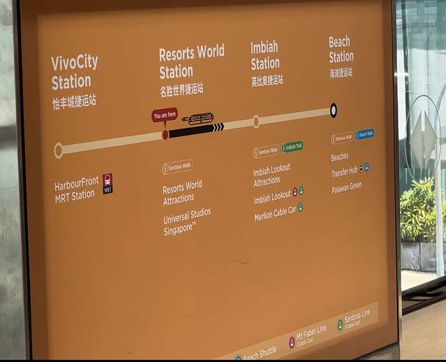 ▪ 岛内线,也有3站。分别是鱼尾狮站(merlion station)-英比奥山顶景区站(Imbiah lookout station)-西乐索景区站(Siloso Point station)。