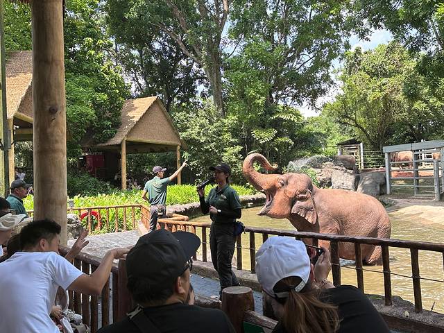 ▪ 早餐结束后就可以周边逛逛,向北走木栈道前往邵氏基金表演剧场10:30有海狮表演,前两排蓝色椅子区域是真会湿,海狮会划拉你一身水。也可以选择场地右侧就坐,因为演出结束后与海狮合影是从右边排队。海狮表演结束后继续向北,11:30在亚洲象区域有喂食表演,一定选择最中间带顶棚的观赏区,遮阳且主持人、大象是集中在这个区域表演。主持人全程英语,语速起飞的介绍大象生活习性等内容,还不断发起提问,答对的伙伴有机会喂食椰子给大象。