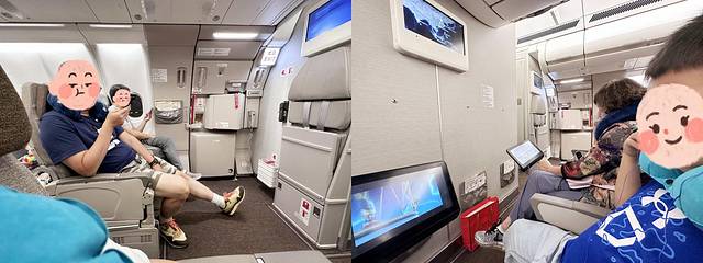 【关于值机】下午3:40大兴飞,因为石头爸爸比较大只,在不具备出门就坐头等舱的经济实力的前提下,且国际航班需现场值机。我们1点前就到了大兴机场,值到了安全通道那一横排的位置。优势就是腿可以直接伸展,不憋屈,石头爸爸全程与空姐Face to Face。但带娃不能坐靠窗的位置,只能坐在中间排,离卫生间一步之遥。方便是方便,但也总有人走过来、走过去上厕所,还是有些叨扰。因为担心航班太晚,入境再耽搁,果断选择都带登机箱,不做托运。