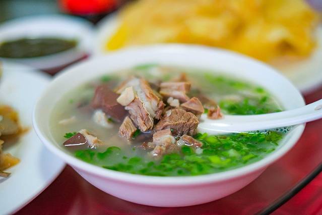 汤池羊汤主要是将羊骨头(筒子骨)一起投入大锅里熬汤,再将切成砣的新鲜羊肉与清洗干净的羊杂一起投入汤锅中煮,然后再配以多种中药,这样烹煮出来的羊肉,肉烂汤甜,醇香浓郁,可饮汤食肉,汤鲜而不膻,肉嫩而不绵,风味独特,再加以重要的调和,使得这羊肉汤更加滋补益气,温中散寒。