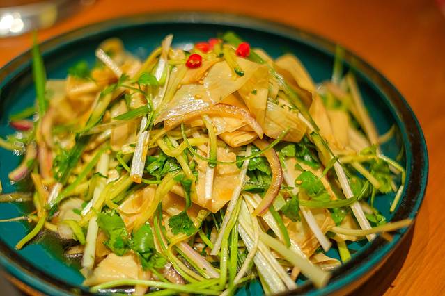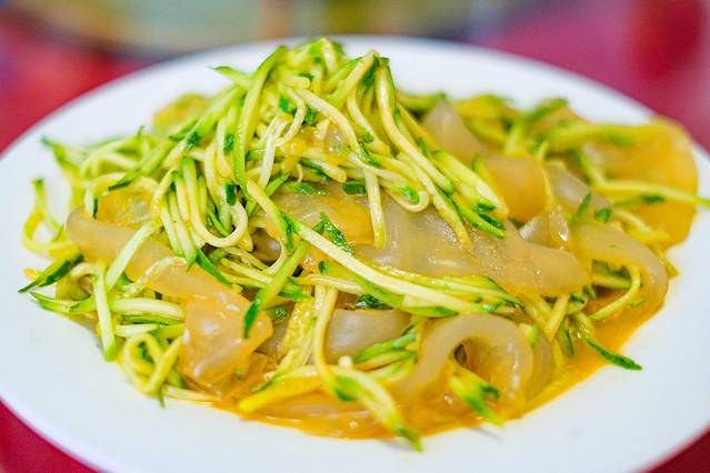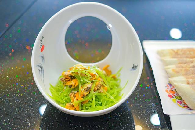 主要由酸菜、鸡蛋、紫菜、粉条、海蛎子和肉丝组成,然后分成条状摆盘,色彩搭配很好看,味道有点咸,可以配春饼吃,也可以直接拌着吃。
