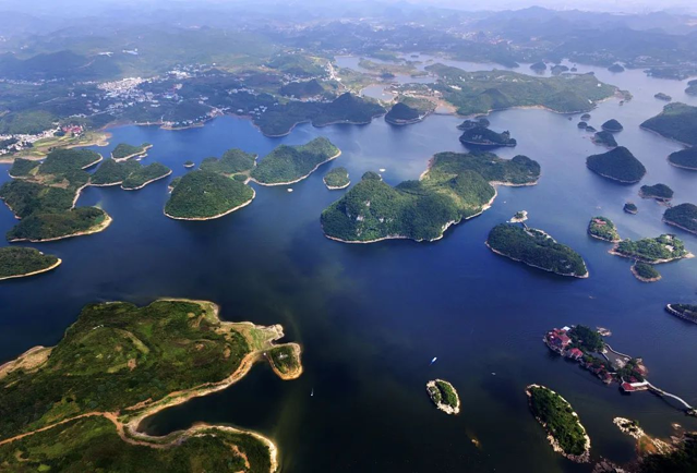 湖面碧波荡漾,四周青山隐隐。泛舟游弋于危崖幽谷,群凫乱飞的汊湾,或换乘小橡皮船驶入湖边的桃湖洞寻幽探奇,别有一番情趣。