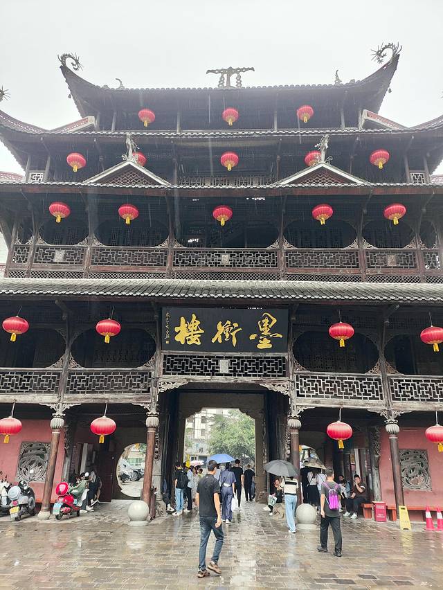 大门进入之后回头看。恩施土司城,又称墨冲楼,高25米,宽12米,纯榫卯结构木楼,由苏州园林设计院设计,地方民间艺人承建。