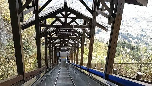 扶梯就类似于超市的那种滚梯,一共9级,全长688米。从电梯往下看,距离地面200米,海拔高度从1228米升至1428米,相当于50层高楼。坐完9级电梯估计用了20分钟,也是七星寨专属。