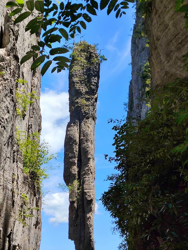 七星寨的标志“一炷香”,高150米,最细处仅4米。