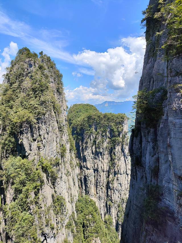 山峰耸立,狭窄处仅容一人通过,开阔处可以俯视群山,豁然开朗