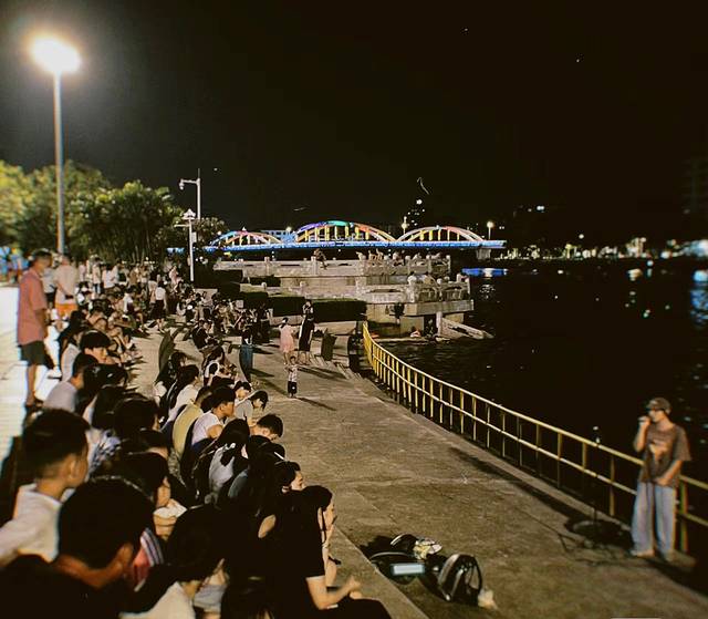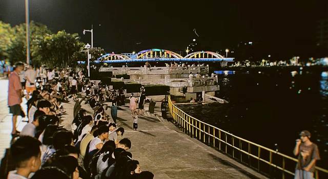 矗立的暖光灯把广场笼罩在电影感的氛围里,影子被拉的很长很长,面孔和身影在特殊的光影下像有了抽帧的质感,江风和人声乐曲在场域里自由飘荡,与南方的潮湿空气融合后构成了某种超脱