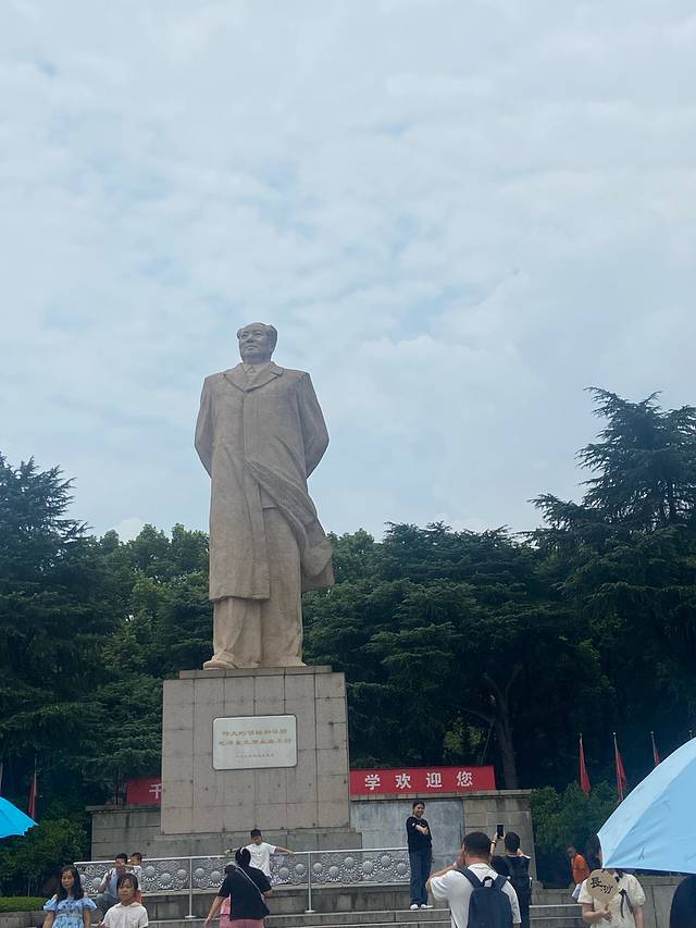 下车就能看到左前方的东方红广场,先在东方红广场边上坐着休息(天气炎热),随着大流往里走,走到了岳麓书院的外围(本来的打算是爬岳麓山,所以外围转了一圈,走回头路,从小吃一条街前往岳麓山),通往岳麓山大门的路是一条陡坡,慢慢爬到门口,买了观光车票(发现不是观光车,而是小大巴),排队坐车估计得两小时,排了一会,我说顶上也没啥风景,爸爸决定不要排队等车上山了,直接不要去了,欣然接受。