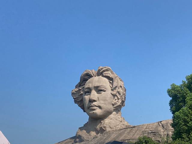 刚吃橘子洲头地铁站,就看到很多乌泱泱的头,因为提前做了功课,在手机上预约好了小火车的票,直接往右手转弯前往坐小火车的地方,排队不太久就上车了。沿途也没啥特别好的风景,很快就到了小火车目的地。下了小火车,步行400多米,跟着人流走到青年毛主席头像的面前,在橘子洲头的牌子那给滚滚照了张照片(非常明显不乐意了,因为天气热,又想去玩水)