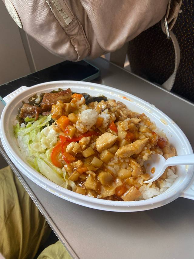 因为早晨出发匆忙,没来得及买早点,在火车上点了份宫保鸡丁给爸爸,而我和滚滚靠着方便面填肚子。