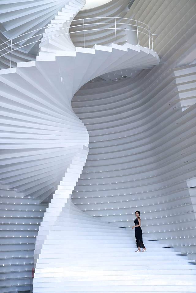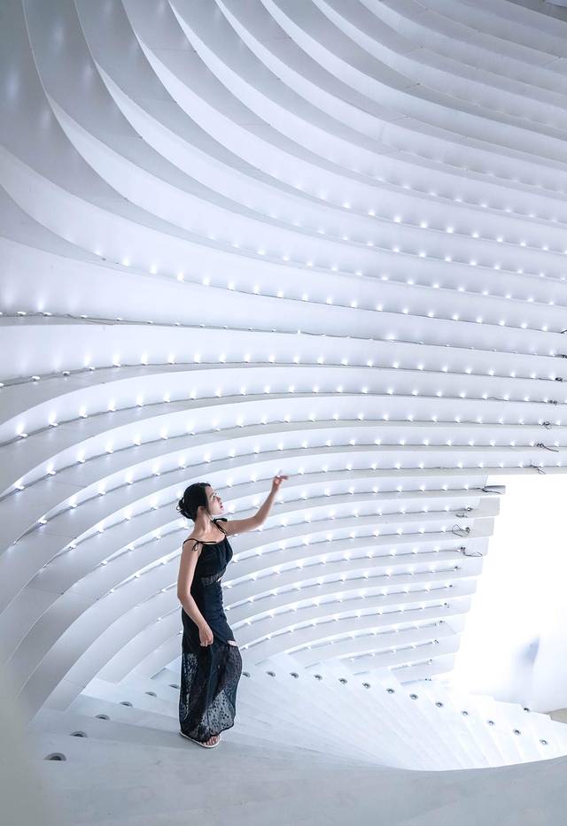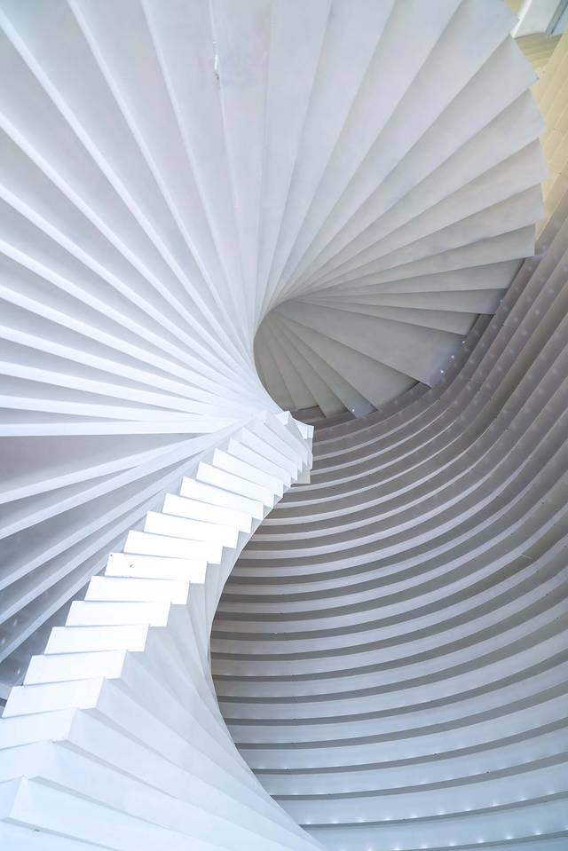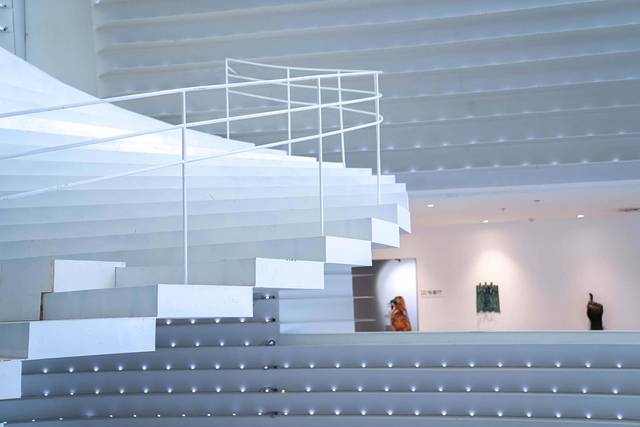 一进入美术馆就会被眼前的白色旋转楼梯所吸引,纯白色的楼梯从一楼蜿蜒向上至三楼,可以走向楼梯的适当位置,展现了空间的艺术之美。