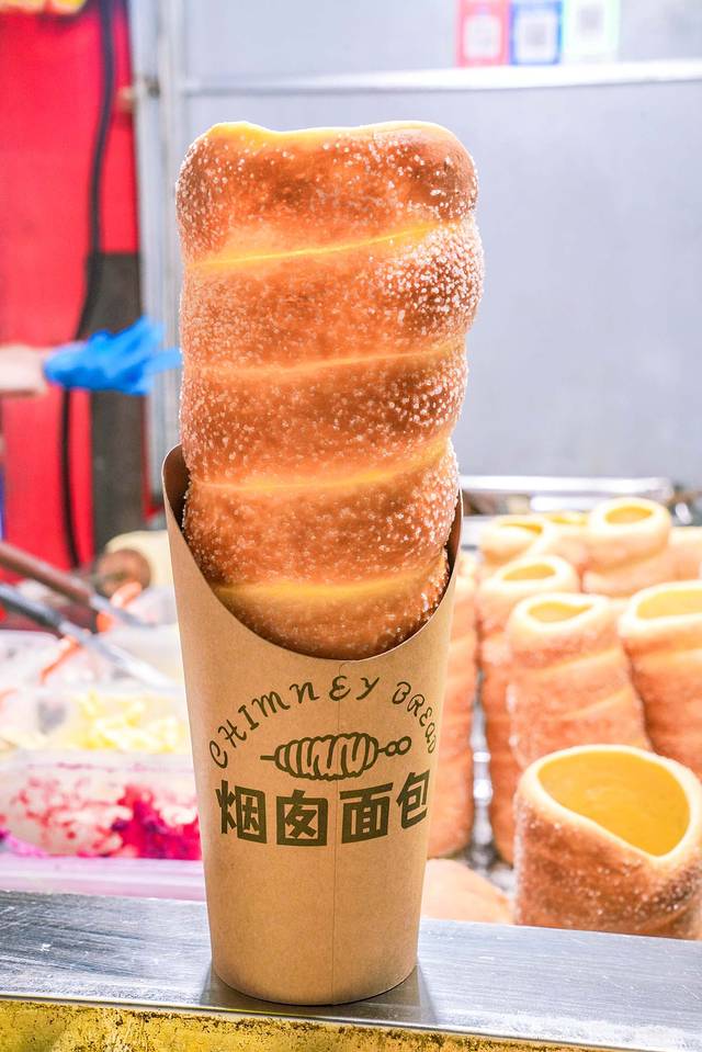 烟囱面包冰淇淋超大一个烟囱面包,在火上慢烤后变得硬邦邦加入自己喜欢的口味以及丝滑冰淇淋,绝对是降温神器。