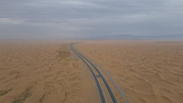 沙漠是一个神奇的地方,在这里任何生命都可能被流沙所吞噬。沙漠中的公路堪称人类奇迹,在茫茫大沙漠中挖通了一条公路,为了阻挡住这滚滚黄沙,建设者们在道路两侧铺设芦苇草方格,以起到防沙固沙的效果。正是因为国家基础建设的发展,我们才可以自驾到这大漠深处,看到罕见的景色。