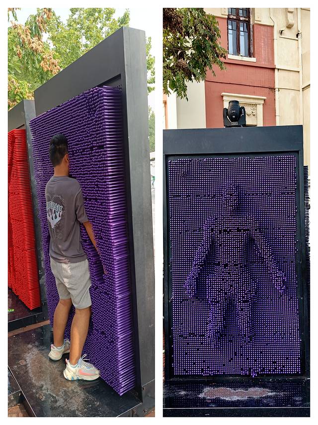 围墙都是用青花、粉彩等瓷瓶,接合处用红色、紫色的水晶粘合城的。院墙是用635个青花或彩瓶粘接成的,瓶的谐音。因谐音'瓶、紫、红'取名鸿运当头 紫气东来 平安墙