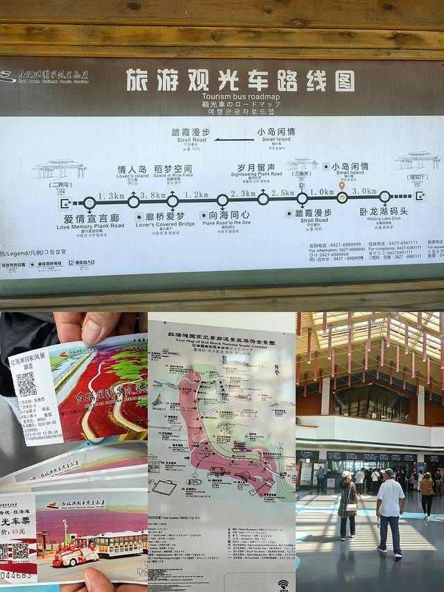 红海滩现在免票,但售票处要买45/人的小火车票(北门进入必须买的,否则太远了)。红海滩廊道有两个门,主要景点就在南门大约3公里的地方,可以花20元停车费直接到达景点。<稻梦空间><廊桥爱梦>,个人觉得就这两个景点值得去看看,其余的如果有时间有体力- - - - -