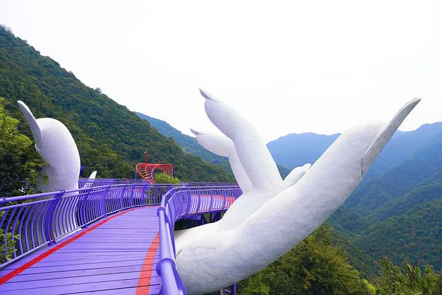 犹如纤纤玉手把你捧在手心的感觉,散落在山谷间的紫色飘带,沿着山势而建蜿蜒曲折,沿途还能欣赏秀美的山川,喊泉那里还能声控喷泉,考验你的肺活量来了,看你能呐喊出多高的水柱来