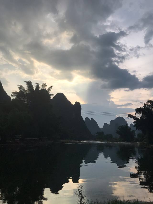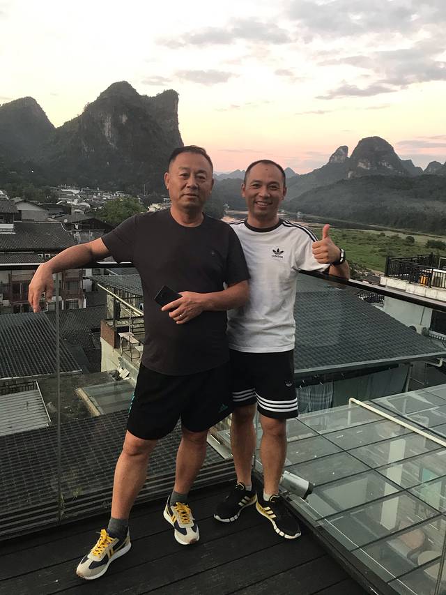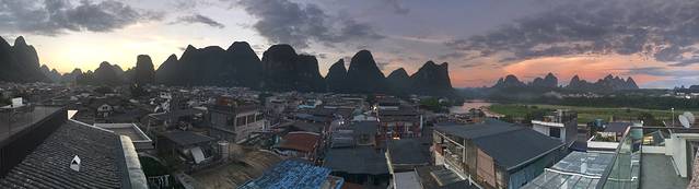 屋顶上目之所及是漓江蜿蜒流淌,江面上好似还有渔家在辛勤劳作,两岸农家做饭的炊烟四起,晚霞洒满了半个天空,周围宁静祥和,大山也好似告诉我“好好享受吧”!这一幕不就是听邓丽君的《小城故事》里我脑海中的画面吗!